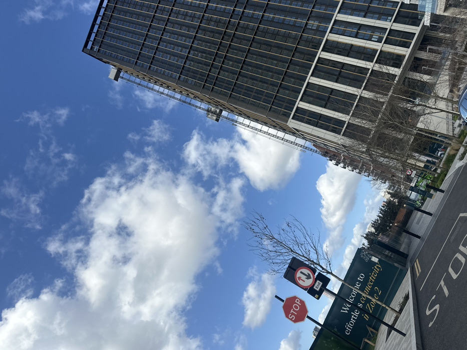 An outdoor scene in Upton Gardens, Upton Park, East London, United Kingdom, is depicted under a bright blue sky with scattered white cumulus clouds. A tall, dark, multi-story modern building, characterized by numerous grid-patterned windows and lighter horizontal architectural bands, dominates the right side of the frame. A construction hoist/elevator system is visibly attached to the exterior of this building. In the foreground on the left, a red octagonal "STOP" sign is mounted on a pole, adjacent to a circular black and white sign displaying two vertical arrows and the text "End". Below these signs, a green construction hoarding is present, featuring white text that partially reads "Welcome to effortless connectivity in Zone 2". The immediate foreground shows a paved road with the word "STOP" painted in white on its surface. Several young, leafless deciduous trees are distributed throughout the scene, and further paving with streetlights is visible in the middle ground. No individuals are discernible.