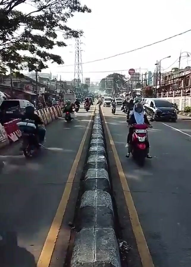 view from a moving motorcycle driving on a busy road. There are numerous cars, motorcycles, buses, and people visible. The motorcycle is traveling on a lane divided by concrete barriers. There is a tree on the left side of the road and buildings lining both sides. The sky is bright. The motorcycle approaches a traffic light.