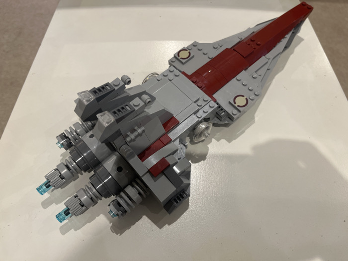 A static, elevated perspective captures a LEGO brick model of a spacecraft, approximately 30-40 cm in length, resting on a flat, off-white surface