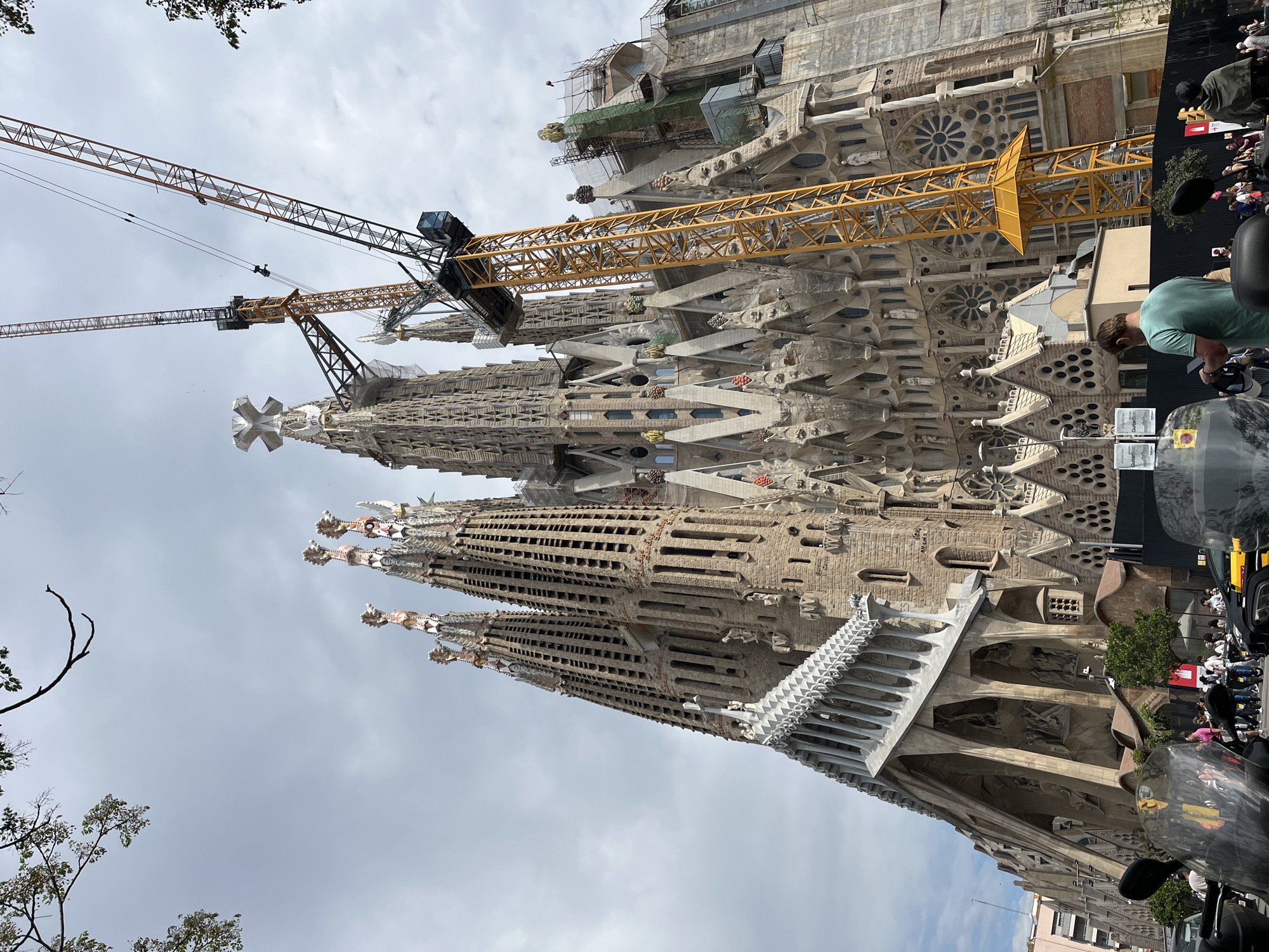 The image depicts the Sagrada Familia basilica in Barcelona, Spain. The basilica is under construction, evident from the presence of two large cranes. The cranes are positioned on different sections of the building, with one crane extending towards the sky, and the other oriented horizontally. The basilica features intricate facade details. People are visible on the sidewalk alongside the basilica, and a vehicle is parked on the street. The sky is cloudy.