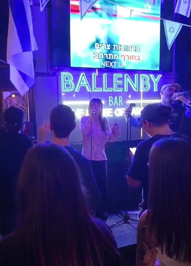 A bar called Ballenby is hosting a performance. A woman in a striped shirt is singing into a microphone while other people sing background. A large screen behind them displays lyrics in Hebrew. A crowd of people is watching the performance, with some holding drinks. The bar is decorated with Israeli flags and blue lights. Several of the people in the audience raise their hands in the air, as if they are feeling the music.