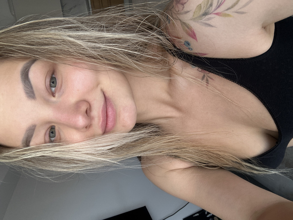 A female subject is depicted in a close-up, chest-up shot, looking directly at the camera with a slight smile. She exhibits long, wet-appearing blonde hair with darker roots, partially obscuring her face and draping over her shoulders. Her eyes are green, and her eyebrows are well-defined. There is a slight erythrodermic appearance to her nose and cheeks. She is attired in a black tank top or camisole featuring a decorative trim along the neckline. A prominent floral tattoo, rendered in shades of pink, green, and blue, is visible on her left shoulder and upper arm. Additional linear tattoos are present on her upper chest, inferior to the clavicle. The background suggests an indoor environment, with a muted grey wall on the left displaying a partial view of a dark rectangular object, and a lighter-toned wall on the right. No visual identifiers within the image allow for the determination of a specific location within Budva, Montenegro.