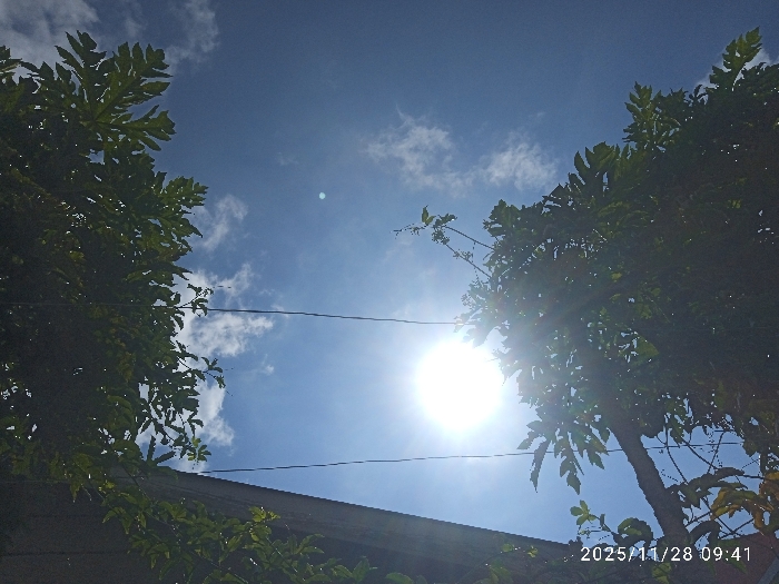 Sunlight fills a blue sky scattered with wispy clouds, viewed through the leaves of trees on either side. Overhead wires stretch horizontally across the frame. A grey roof is visible at the bottom. The date "2025/11/28 09:41" is imprinted in the bottom right corner.
