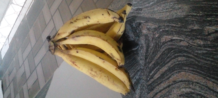 - "A cluster of approximately 7-9 ripe, yellow bananas with scattered brown blemishes rests on a dark, horizontally striated countertop" by FM-7exiW2, licensed under CC BY 4.0