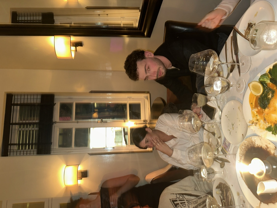 A group of people are seated at a table in a restaurant. Plates and glasses are scattered across the table, indicating a meal has been eaten. A man in a black jacket is looking towards the camera. A woman in a white shirt sits beside him, appearing to be engaged in conversation. Another person is blurred at the bottom of the frame. Two wall lamps illuminate the scene. A large window with bars is behind the woman, and a mirror hangs on the wall behind the man.