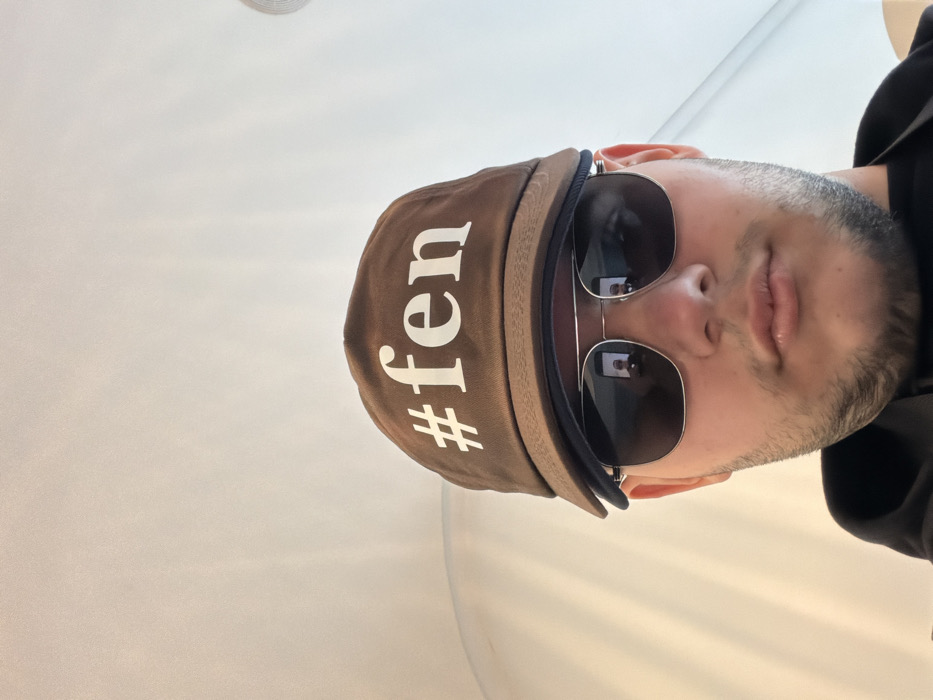 The image presents a close-up, chest-up view of an adult male. The individual wears a brown baseball cap with the white text "#fen" across the front, and dark-lensed aviator-style sunglasses with silver frames. The sunglasses reflect a smartphone held by the subject, suggesting a self-portrait. A light beard or stubble covers the chin and cheeks. The subject is wearing a dark-colored garment. The background is an illuminated, light-colored indoor setting, featuring a subtle curved wall or structure on the left and a faint circular fixture in the upper right. The specific location in Grau i Platja, Spain, cannot be determined from the visual information provided.