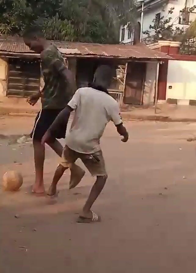 Two young males are on a dirt road. The older one wears a camouflage-patterned shirt and black shorts, and the younger boy has a white shirt and patterned shorts. The older boy balances a soccer ball on his foot. They stand next to each other, then walk down the dirt road together. Other buildings and people are in the background.