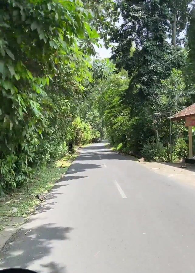 A first-person view from a moving motorcycle shows a narrow paved road winding through dense green foliage