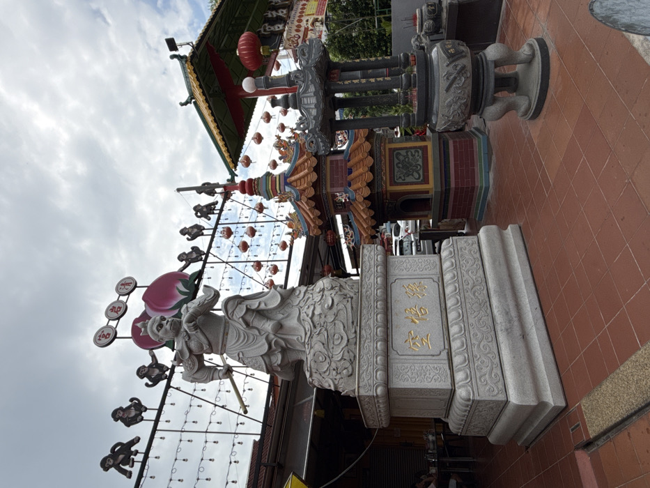 A low-angle shot displays a stone statue of a deity figure, intricately carved. Behind the statue are poles adorned with monkey figurines and red lanterns. Further back, a multi-tiered pagoda-like structure sits next to a large, ornate incense burner on stone legs. The sky is cloudy, and the foreground features tiled flooring.