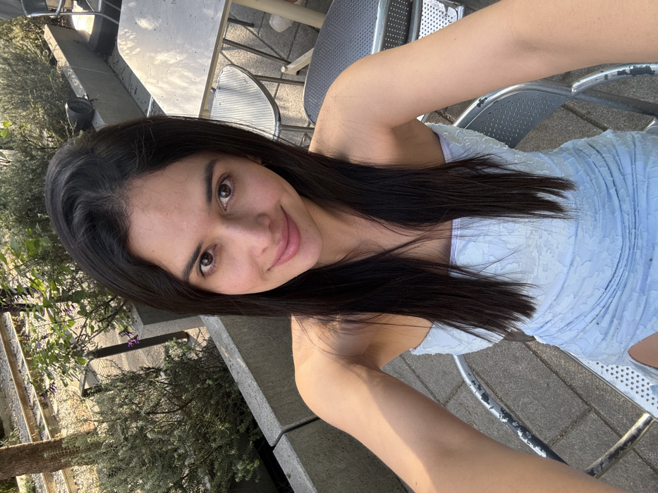 A young woman takes a selfie outdoors. She has dark hair, brown eyes, and fair skin, wearing a light blue lace dress. She sits at a metal table and chair on a paved patio. Green plants grow near a concrete wall in the background. Sunlight shines on the scene, creating a bright, casual atmosphere.
