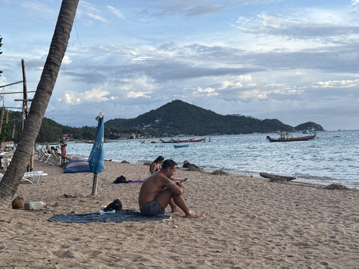 This image depicts a sandy beach scene in Tambon Ko Tao, Thailand. The environment consists of a light brown sandy beach in the foreground and midground, transitioning to a body of water in the midground and background. Distant, lush green, forested hills and smaller islands are visible on the horizon under a sky with scattered clouds and patches of blue. The lighting suggests late afternoon. In the foreground, a large, dark brown palm tree trunk is prominent on the left, angled upwards. Near its base are two coconuts and a clear plastic bottle. Towards the center-right, a shirtless adult male is seated on the sand, facing left with his knees drawn up. He is wearing dark patterned swim shorts and is actively looking at a smartphone held in his hands. He is situated on a dark blue towel, with an additional dark item next to it. Partially obscured to his immediate left is another individual seated on the sand. In the midground, a blue beach umbrella stands upright to the left of the central male. Further left, a line of white plastic lounge chairs is visible on the sand, some occupied by indistinct figures. Behind these chairs, a wooden pole structure with string lights is present. Multiple long-tail boats are scattered across the water; a prominent reddish-brown long-tail boat with a white canopy is anchored towards the right-center. Other smaller boats, including a red one, are also in the water. Debris, including logs and branches, is evident along the waterline. Numerous individuals are visible on the beach and wading in the water. The background shows the distant coastline with green hills and scattered buildings.