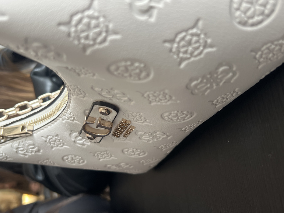 The scene takes place in an indoor setting within the city of Veliko Tarnovo, Bulgaria. A white Guess brand handbag, featuring an embossed pattern of stylized floral or geometric motifs, rests on a dark, flat surface. The handbag displays gold-toned hardware, including a metallic zipper closure with a visible pull tab and a partial chain-link strap. A prominent metallic gold 'G' logo is affixed to the front, situated above the 'GUESS EST 1981' inscription, which is presented on a rectangular plaque. The background is significantly blurred, showing indistinct shapes. These elements include a dark mass, suggestive of clothing worn by an individual, and a diffused light source. No specific individuals are clearly identifiable, and no discernible actions or interactions are depicted within the visible frame. The immediate environment of the handbag is well-lit, transitioning to a uniformly low-lit, blurred background.