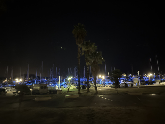 The image displays a marina at night in Antibes, France. Numerous boats, predominantly sailboats with visible masts, are moored in the water, many illuminated with a distinct blue light. The foreground features a dimly lit paved area, possibly a parking lot or promenade, with visible ground markings. Three tall palm trees stand in the midground, partially obscuring the marina, alongside smaller trees. Several vehicles are present, including a light-colored camper van or utility vehicle on the left and a silver SUV on the right, parked along the marina's edge. Warm yellow streetlights illuminate parts of the foreground and marina infrastructure. The sky is dark, with several faint green lights visible in the upper center. No individuals are discernible in the scene.
