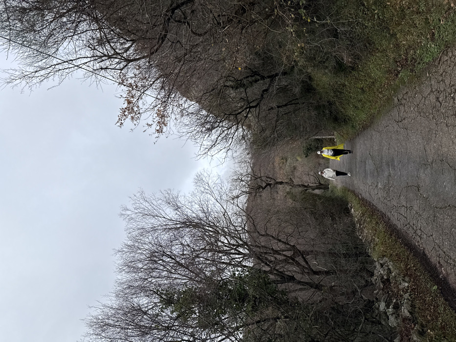 An overhead, wide-angle image captures a scene in Čučuci, Montenegro, on an overcast day. Two individuals are observed walking away from the camera along a narrow, cracked asphalt road that bisects dense, leafless deciduous trees and undergrowth. The person on the left wears a white long-sleeved top, dark trousers, and a white baseball cap. The person on the right wears similar attire, a white long-sleeved top, dark trousers, and a white baseball cap, with a bright yellow garment draped over their shoulders like a cape. The road exhibits extensive cracking and minor vegetative growth in its fissures. The surrounding environment consists of a forest or wooded area with predominantly bare branches, indicating a cooler season. Evergreen foliage is visible among the bare trees on the left side of the road. Distant hills or mountains are faintly visible under the grey, cloudy sky.
