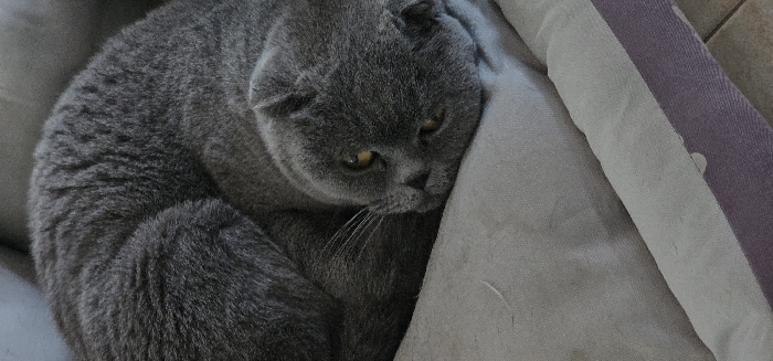 - "A grey-furred domestic cat, possibly a British Shorthair, is depicted resting curled up within a pet bed" by FM-bbBX33, licensed under CC BY 4.0