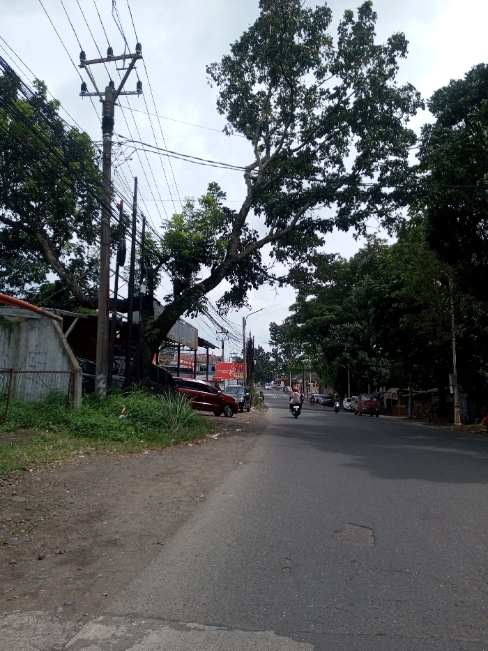 The image depicts a street scene in Khajuripada, India, under an overcast sky. A two-lane asphalt road, exhibiting visible patches and wear, extends from the foreground into the distance. On the left side, a dirt shoulder with overgrown grass and weeds separates the road from a grey concrete structure partially obscured by a metal fence. A prominent utility pole with multiple cross-arms supporting numerous power and communication lines stands on the left. Large, leafy trees densely line both sides of the road, with one substantial tree on the left having branches extending over the road and intertwining with utility lines. Vehicular traffic is present on the road. A maroon car is parked on the dirt shoulder on the left, followed by a darker vehicle. In the middle distance, a person wearing a helmet rides a motorcycle away from the camera in the right lane. Other vehicles, including cars and additional motorcycles, are visible further down the street. Commercial structures with signage are partially visible behind the trees and utility poles on the left side of the road in the distance. The environment is characterized by urban infrastructure integrated with abundant natural vegetation.