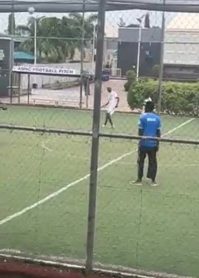 group of people playing soccer on a small artificial turf field surrounded by a tall chain link fence. The field is marked with white lines indicating boundaries. The players are dressed casually, some in athletic wear and others in regular clothing. They are spread out across the field, passing and kicking the ball. Behind the fence, spectators watch the game. The environment appears to be an outdoor recreational facility, with trees and a building visible in the background. A sign reading "AMNC FOOTBALL PITCH" is visible. The weather seems overcast.