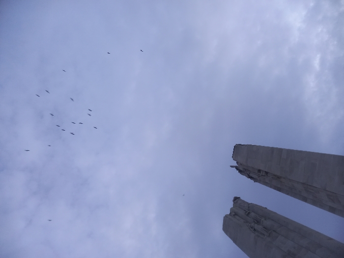 The image depicts a cloudy sky with two tall, grey structures extending upward from the lower right corner. A flock of birds is scattered across the sky to the left of the structures. The scene has a somber, quiet feel.