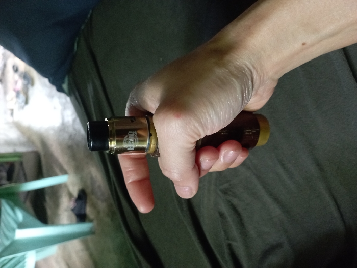 An indoor close-up photograph taken in the city of Meycauayan, Philippines, depicts a human hand holding a vaping device. The hand, exhibiting a light skin tone, grasps a dark brown, cylindrical vaping mod with a brass-colored base. Attached to the mod is a gold-colored atomizer, etched with the word "HEAD," and featuring a black drip tip. The primary subject is held upright in the center-right of the frame. In the foreground and mid-ground, a dark olive green fabric, possibly a blanket or upholstery, is visible with visible creases. The background reveals a light gray concrete floor, upon which rests a black slipper. Partially visible on the left is a light green plastic chair. Further in the blurred background, several indistinct items are present on the floor, suggesting a residential environment.