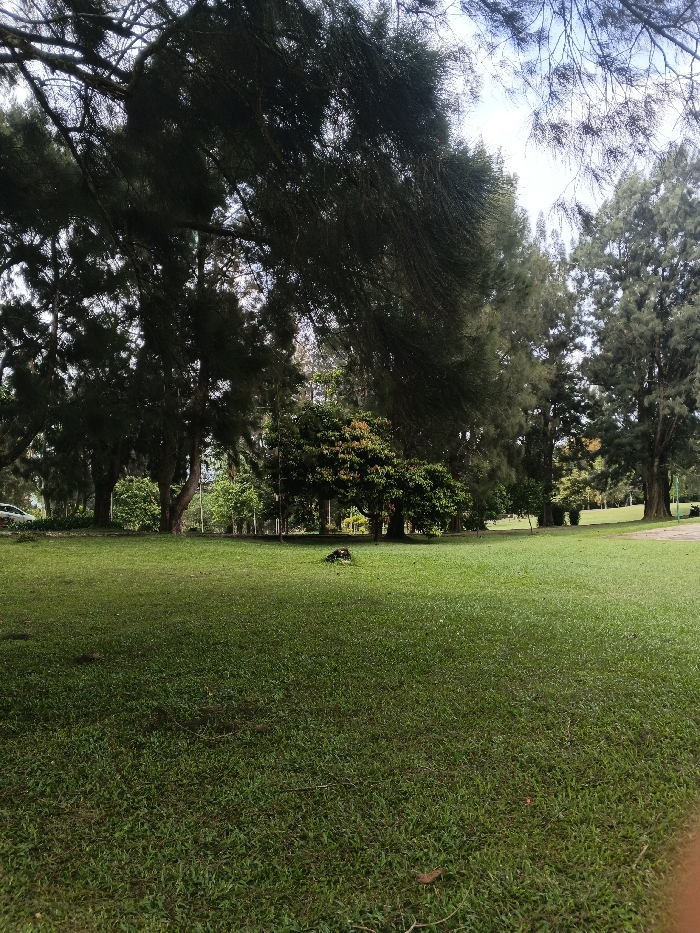 The image displays a expansive green space, identified as a park or garden, within Lalitpur, Nepal. The foreground and midground are covered by an evenly cut, vibrant green lawn. A small, dark, irregular object, resembling a tree stump or a dark rock, rests on the grass slightly right of the central axis in the midground. The background and upper frame are filled with numerous mature trees of varying heights and species, characterized by dense, dark green foliage, some exhibiting lighter green or reddish-brown accents. On the far left, partially obscured by trees, a segment of a white vehicle is visible, suggesting a nearby road or parking area. Shadows are cast across portions of the lawn, indicating a light source, likely daylight, filtering through the tree canopy. The sky, visible through gaps in the foliage, appears light with minimal cloud cover. No human subjects or discernible activities are present in the scene.