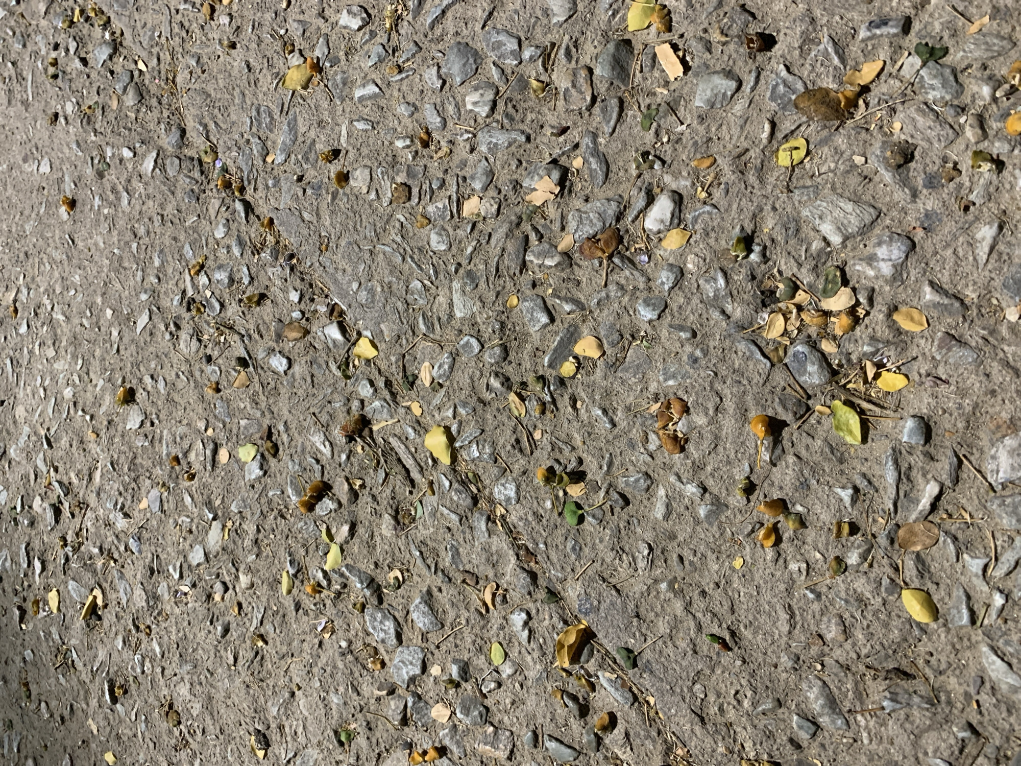 close-up view of a paved surface, possibly a sidewalk or road, in an unidentified location, perhaps within the city of La Tagua, Venezuela. The surface is composed of small aggregate stones set in cement or similar material. The surface is gray and textured. Scattered across the surface are small leaves and plant debris of various colors, primarily yellow and brown, and in varying states of decay. The leaves and debris are randomly distributed. There are no people or animals visible. There is nothing that indicates the location is La Tagua.