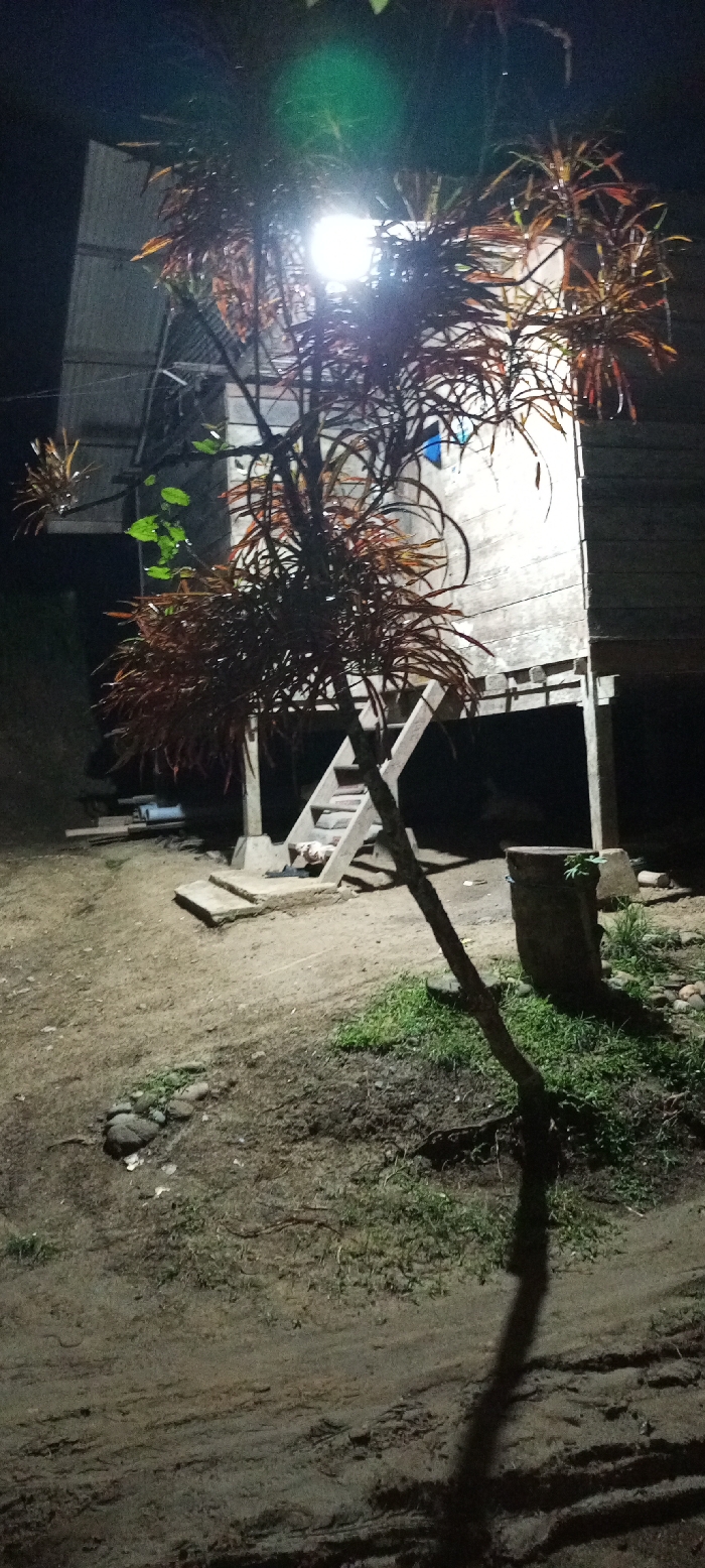 The image depicts a nighttime outdoor scene in Paloh Punti, Indonesia. In the foreground, a multi-stemmed plant with dense, reddish-brown and some green foliage occupies the center, casting a shadow towards the lower right. The ground is composed of exposed dirt with scattered patches of sparse green grass. In the mid-ground, a bright, intense artificial light source, likely an outdoor lamp, is positioned behind the central plant, creating significant lens flare and backlighting the plant. This light illuminates a portion of an elevated wooden structure or house in the background. The structure features light-colored wooden paneling or corrugated material and is supported by visible wooden posts. A wooden staircase with multiple treads ascends from the dirt ground towards the elevated structure on the left side. To the right of the central plant, near the base of the structure, a dark, cylindrical object resembling a concrete block or pillar is present. No human subjects or discernible actions are visible in the frame. The ambient environment is dark, indicative of nighttime conditions.