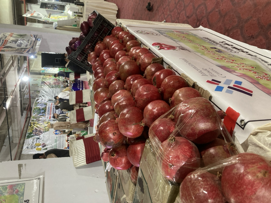 The scene depicts an indoor agricultural exhibition or trade show located in Quetta City Tehsil, Pakistan. In the foreground, a white-clad display table is laden with numerous red pomegranates, arranged in rows, with some in the immediate foreground individually plastic-wrapped. Adjacent to the pomegranates, several rectangular, plastic-wrapped items are stacked. A white banner displaying "International Trade Centre" with a logo and Urdu text is affixed to the front of the table. The floor is covered in a red carpet. In the midground, behind the main pomegranate display, multiple individuals are present. Several men, dressed in traditional Pakistani attire including shalwar kameez, waistcoats, and some wearing turbans or jackets, are standing, conversing, and moving between exhibition booths. One man in a light brown traditional outfit stands near a table on the left. To the right, a black plastic crate filled with additional red fruits, likely pomegranates, rests on another table. Black speakers are visible between the booths. Various display booths feature white tablecloths and chairs draped in white and maroon fabric. Large banners are suspended in the background, one prominently displaying "AGRICULTURE DEPARTMENT" and text in Urdu, indicating the nature of the event. The environment features an industrial-style ceiling with visible lighting fixtures and ventilation.