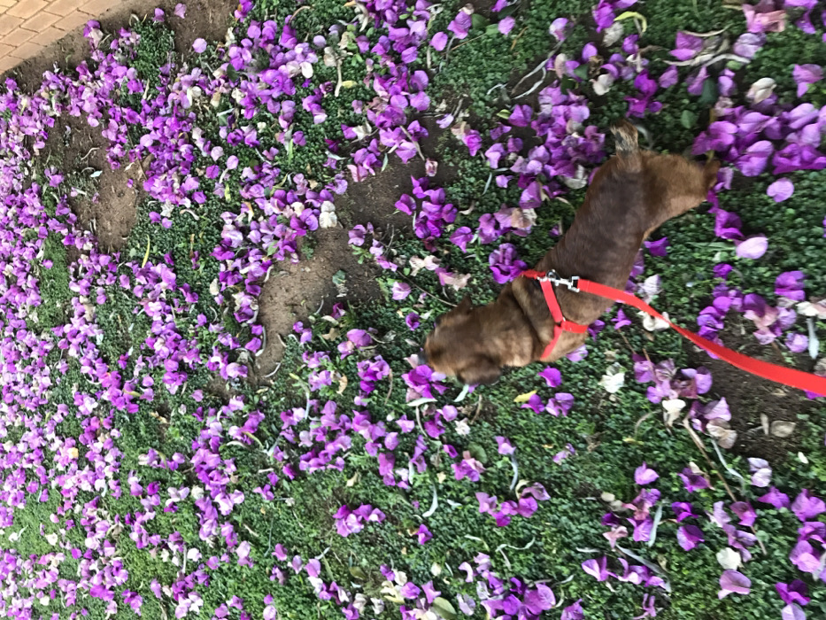 The image depicts an outdoor ground-level scene in Germiston, South Africa. A brindle-patterned dog is visible from an overhead perspective, positioned in the lower right quadrant and facing towards the upper left. The dog is fitted with a red harness, from which a red leash extends downwards and out of the frame, implying a handler is present outside the view. The ground is predominantly covered by a dense layer of small, green foliage, interspersed with visible patches of bare brown soil. Numerous vibrant purple flower petals are extensively scattered across the entire ground surface. A section of a light-brown brick wall is partially visible along the upper right edge of the frame. No human figures are present within the view. The dog appears to be in the process of walking across the petal-covered ground.