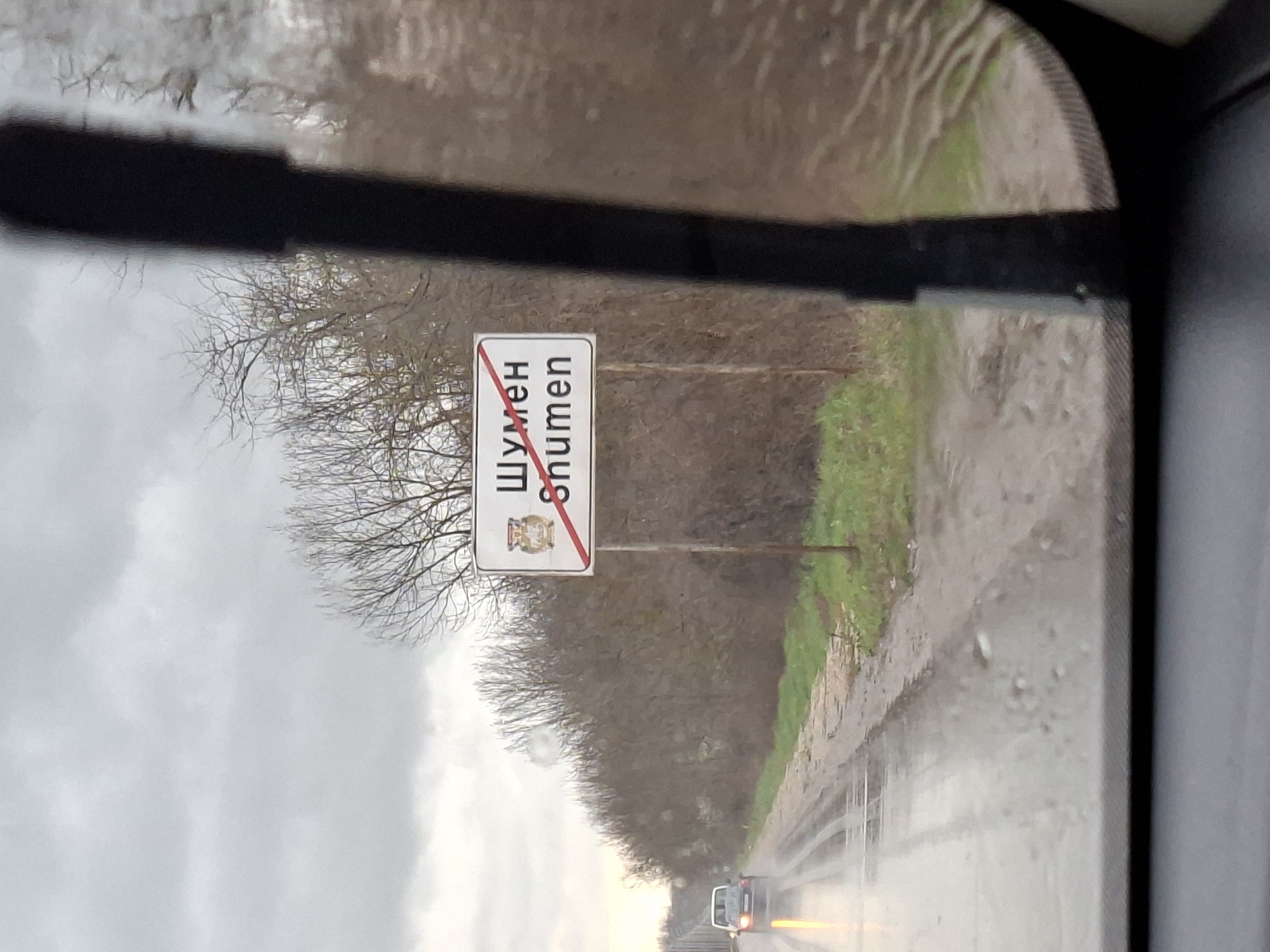 The scene is captured from inside a vehicle, looking forward through a rain-streaked windshield. It depicts the exit from the city of Shumen, Bulgaria, on a wet, two-lane asphalt road under an overcast sky. On the right side of the road, a white rectangular road sign is mounted on two brown wooden posts. The sign displays "Шумен" (Shumen in Cyrillic) and "Shumen" in Latin script, both crossed out by a red diagonal line, indicating departure from the settlement. An emblem featuring an owl is visible to the left of the Cyrillic text. The asphalt road, glistening with water from recent rain, recedes into the distance. A light-colored sedan, with its taillights illuminated, is visible ahead on the road, moving away from the camera. The right side of the road is bordered by a dense line of leafless deciduous trees and bushes, with patches of green grass along the shoulder. Further back, more bare trees are visible against the dull, grey sky. A dark, vertical element, consistent with a vehicle's A-pillar or a windshield wiper arm, partially obstructs the right side of the frame. The top edge of the camera vehicle's dashboard is visible at the bottom of the image.