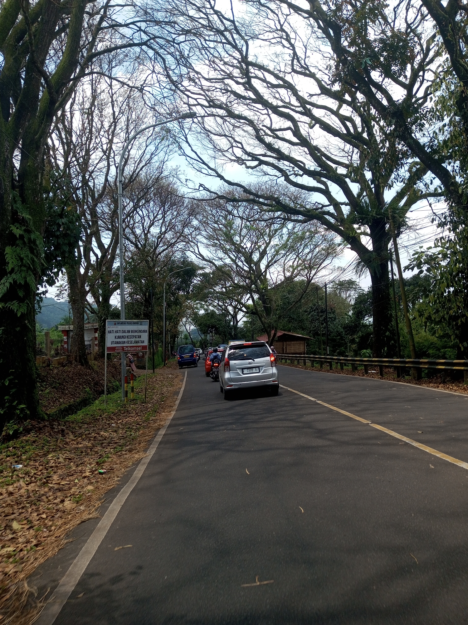 The image depicts a road lined with tall trees, their branches forming a canopy overhead. Traffic is visible on the road, including a silver car in the foreground. A sign is present on the left side of the road, displaying text in Indonesian. The location is in Indonesia.
