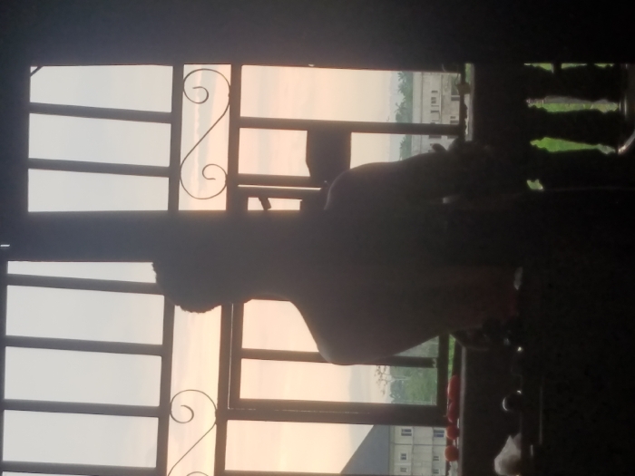 An image shows a person, apparently shirtless, silhouetted against a brightly lit window with metal bars. The window provides a view of distant buildings and greenery. The interior is dark, making the person a prominent silhouette. The window bars have decorative curved elements, adding to the visual complexity. Another window with green view is seen from the right side.