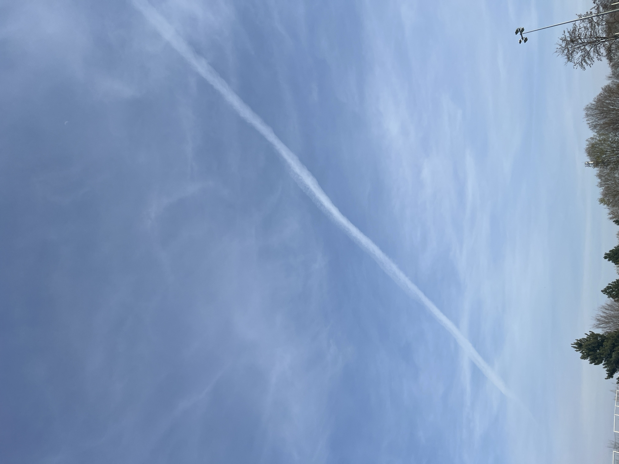 The image displays an outdoor daytime scene in Schiltigheim, France, primarily featuring a light blue sky with scattered, thin cirrus clouds. A prominent, linear white aircraft contrail extends diagonally across the sky from the lower-left to the upper-right. A faint, slender crescent moon is visible in the upper central-left portion of the sky. Along the bottom edge, a strip of vegetation includes dark green coniferous trees and bare deciduous trees, indicating a temperate climate during a non-foliage season. On the far left, a segment of a white horizontal structure, possibly a fence or barrier, is partially visible. To the far right, a tall, grey metallic light pole with a cluster of four downward-facing light fixtures is present. In the distant mid-ground, a vertical metallic structure, possibly a communication tower, rises above the bare tree line. No individuals, actions, or direct interactions are depicted.