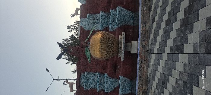 A landscape features a tiered monument with an apple at its center. The monument is adorned with faux-stone textures. Perched above it are sculptures of a goat and an eagle. Pavement laid in a geometric pattern of gray tones edges one side. The backdrop consists of trees and a light, overcast sky.