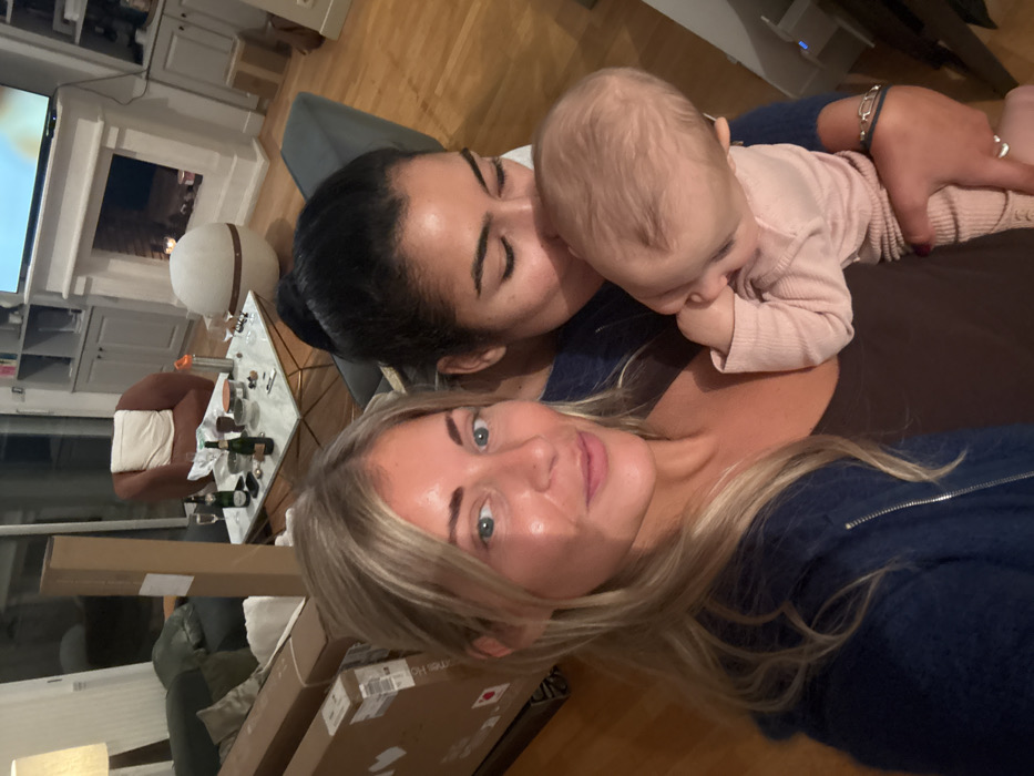 The image depicts three individuals in a domestic living room setting, presumed to be in Rueil-Malmaison, France. **People:** * **Subject 1 (Left):** A blonde-haired adult female, light-skinned, with blue eyes, looking directly at the camera. She has long hair parted on the side and wears a dark blue zippered hoodie over a dark brown tank top. Her expression is a slight smile. * **Subject 2 (Center-Right):** A dark-haired adult female, olive-skinned, with her hair tied back, seen in profile, looking down and kissing the head of the infant. She wears a dark blue long-sleeved top. * **Subject 3 (Right):** An infant, light-skinned, with light-colored hair, held by Subject 2. The infant is dressed in a light pink ribbed long-sleeved top and matching pants, and has one hand near its mouth. **Scene/Environment:** The subjects are positioned in the foreground of a living room. The room features a light-colored hardwood floor. In the background, several pieces of furniture and decorative elements are visible: * A green sofa with patterned cushions. * A brown armchair with a white cushion. * A modern coffee table with a white marble top and gold-toned geometric base, upon which two empty champagne bottles, several champagne flutes, and multiple small bowls containing snacks are arranged. * A white fireplace mantel with a television mounted above it. * Built-in grey cabinetry and shelving flanking the fireplace. * A large, spherical white decorative object with a brown band, positioned near the fireplace. * A floor lamp with a fabric shade is partially visible on the far left. * Multiple large, rectangular cardboard boxes, indicating recently arrived or unpacked items, are stacked on the left side of the room, partially obstructing the view of a sofa. **Actions/Interactions:** Subject 1 is taking a selfie, while Subject 2 is affectionately kissing the infant's head. The overall interaction suggests intimacy and familial connection. The presence of champagne bottles and snacks on the coffee table indicates a recent gathering or celebration. The unpacked boxes suggest a potential recent move or acquisition of new items.