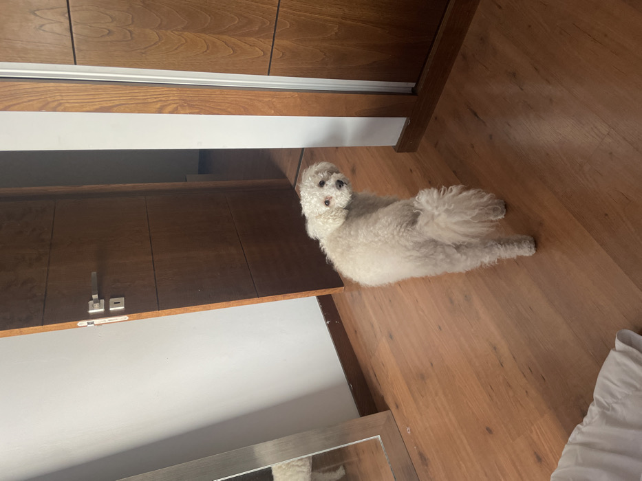 - "An indoor scene in Mirandela, Portugal, displays a small, cream-colored, curly-haired dog standing on a polished light brown wooden floor, positioned with its body facing away from the viewer but with its head turned to look directly at the camera" by FM-Dnkxt1, licensed under CC BY 4.0