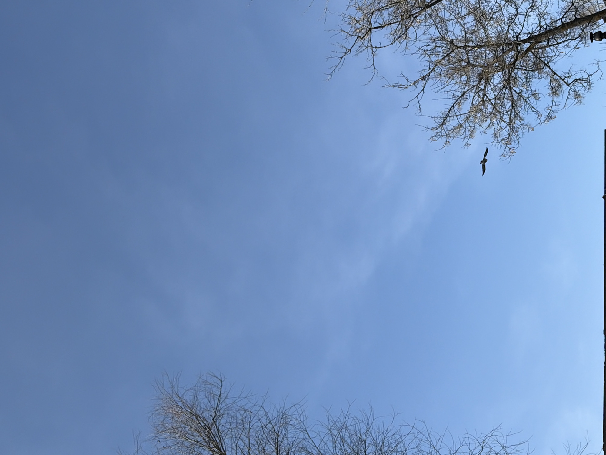 view looking up at a blue sky with thin, wispy clouds. Bare tree branches are visible in the top right and bottom center of the frame. A bird is flying in the top right quadrant of the image. There is a vertical black line on the right side of the image. The location is inferred to be in the city of Chaikovsky, Russia, but this is not visually confirmed. No people are visible.