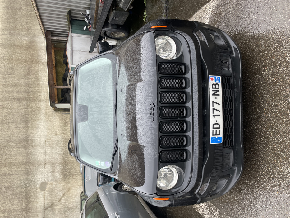 The image displays a black Jeep Renegade SUV, viewed from the front, parked in what appears to be a service or industrial yard in Maurepas, France
