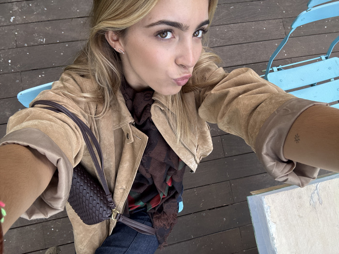 A young, light-skinned woman with long blonde hair and brown eyes is depicted in a close-up selfie, making a pouting expression. She is wearing a tan, suede-like jacket over a dark, patterned scarf and blue jeans. Small stud earrings are visible in her left ear. A small asterisk-like tattoo is present on her right inner forearm. A dark brown woven shoulder bag with a thin strap is visible hanging on her left side. The background consists of dark wooden floorboards, light blue slatted metal chairs, and a light-colored rectangular object, possibly a canvas or board, partially visible in the bottom right. This scene is located in Villeurbanne, France.