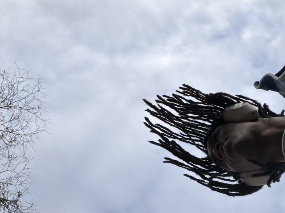 An individual with a dark complexion is depicted looking directly upwards. The person has numerous dark dreadlocks that extend upwards and appear in motion. Light-colored, likely off-white, over-ear headphones are worn by the individual. A portion of dark clothing, possibly a jacket collar, is visible on the lower right. The background consists of an overcast or heavily clouded sky, with the silhouette of bare tree branches visible along the top edge of the frame. This scene is located in Rosny-sous-Bois, France.
