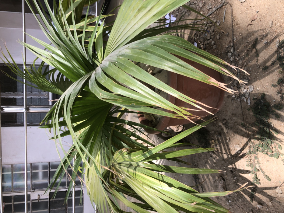 This image captures an outdoor scene in Giginyu, Nigeria, focusing on a single potted plant positioned on a dirt ground. The central subject is a robust, palm-like plant with numerous elongated green fronds radiating outwards. Many of the fronds exhibit browning and desiccation at their distal ends. The plant is contained within a terracotta-colored pot, approximately cylindrical in shape. The ground surrounding the pot consists of light brown earth with small patches of low-lying green vegetation and scattered debris. Strong, direct sunlight illuminates the scene from the left, casting distinct shadows of the plant's fronds onto the ground. In the background, a light-colored building is visible, featuring multiple rectangular windows with metallic frames and grilles. A horizontal metallic railing extends across the upper portion of the background, positioned in front of the building's windows. No individuals, actions, or specific interactions are present in the frame.