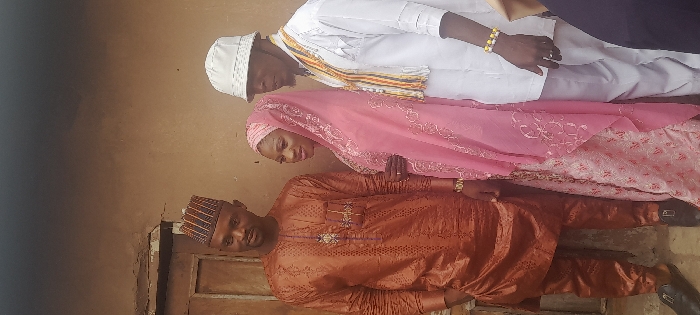 The scene is located in the city of Toto, Nigeria. Three individuals are standing outdoors against a weathered, light brown wall. To the left, a man with a beard and a dark, patterned cap wears a long-sleeved, brown traditional tunic and matching trousers, with dark slip-on shoes. His right hand is in his pocket, and a gold-toned watch is visible on his left wrist. In the center, a woman wears a pink hijab and a patterned pink dress, with a ring on her left hand. She looks towards the left. To the right, another man with a beard wears a white long-sleeved shirt, light trousers, a white bucket hat, and a multi-colored striped scarf draped over his shoulders. He has a yellow and white beaded bracelet on his right wrist and a ring on his left ring finger. He also looks towards the left. A partially visible wooden door is situated behind the man on the left.