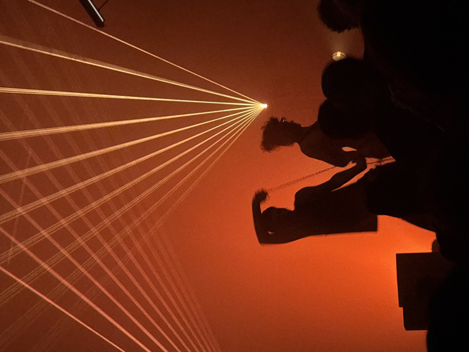 A concert scene is depicted in an orange hue. A multitude of light beams converge from the left to a central point. To the right are silhouettes of people, with one individual in a lower position raising an arm. The lighting is dramatic, creating a stark contrast between light and shadow. The scene has a dynamic energy, suggesting a live performance or show.