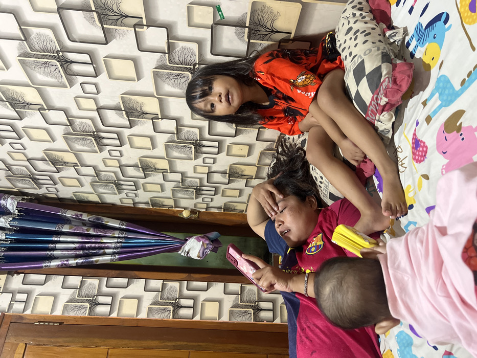 An indoor scene in Wedarijaksa, Indonesia, depicts three individuals on a bed