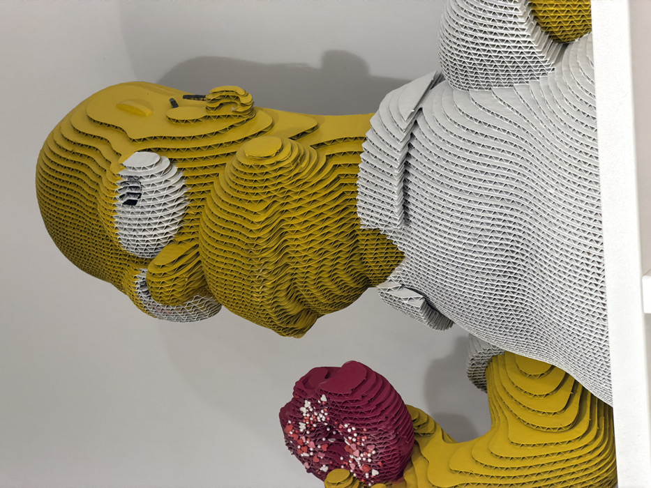 - "A three-dimensional sculpture of Homer Simpson, crafted from layered corrugated cardboard, is depicted indoors against a plain, light-colored wall in Hrodna, Belarus" by FM-YeRL63, licensed under CC BY 4.0