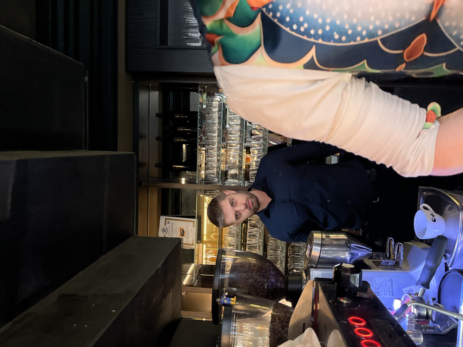 The scene is an interior view of a commercial establishment, specifically a bar or café in Varna, Bulgaria. A male individual, appearing to be an employee, is positioned centrally behind a counter, looking directly at the camera with a neutral expression. He has short dark hair and a beard, and wears a dark collared long-sleeve shirt and dark trousers. Behind him is a multi-tiered glass shelving unit stocked with numerous empty drinking glasses and various bottles, with a "VICTORIA PREMIUM" sign visible on a white document to the left of the shelving. In the immediate foreground on the left, an industrial espresso machine is visible, featuring dual coffee bean hoppers filled with dark beans, a silver coffee grinder, and a black and red control panel displaying "000". A small white cup with a minimalist facial design rests on the machine's drip tray. The right foreground shows the partial view of a second individual's upper body, including a light-colored long sleeve and a section of a vibrant, multi-patterned garment featuring blue, green, and orange tones. Dark overhead structural elements are present.