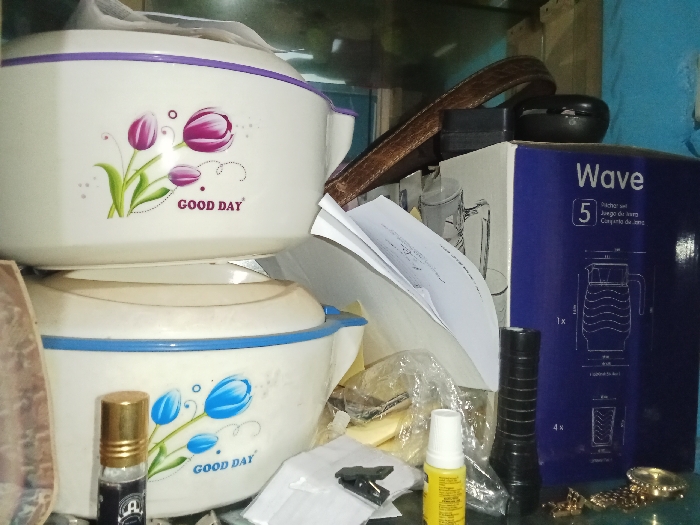This scene is situated in the Inxuba Yethemba Local Municipality, South Africa. The image displays a cluttered indoor surface, likely a shelf. Centrally, two white, octagonal, insulated food containers are stacked. The upper container features a purple rim and a graphic of three purple tulips with green stems, accompanied by the text "GOOD DAY" in black. The lower container has a blue rim and a graphic of blue tulips with green stems, also bearing the text "GOOD DAY." To the right, a vertical blue cardboard box labeled "Wave" displays an illustration of a jug and four glasses, with accompanying text indicating a "Juego de jarra." A brown, leather-textured strap is draped over the top food container and the blue box. Miscellaneous objects are scattered across the foreground and around the primary items: a small, golden-capped roll-on bottle stands to the left of the lower food container; loose white papers are present; a black cylindrical object, resembling a flashlight, stands upright near the blue box; a yellow plastic squeeze bottle with a white cap is on the surface; a transparent plastic bag contains indistinct items; a small black clip rests on a piece of paper; and a gold-colored, ornate metallic object lies to the far right. A small black, oval-shaped case or container is partially visible above the blue box, obscured by the brown strap. The background is an indistinct, uniform surface.
