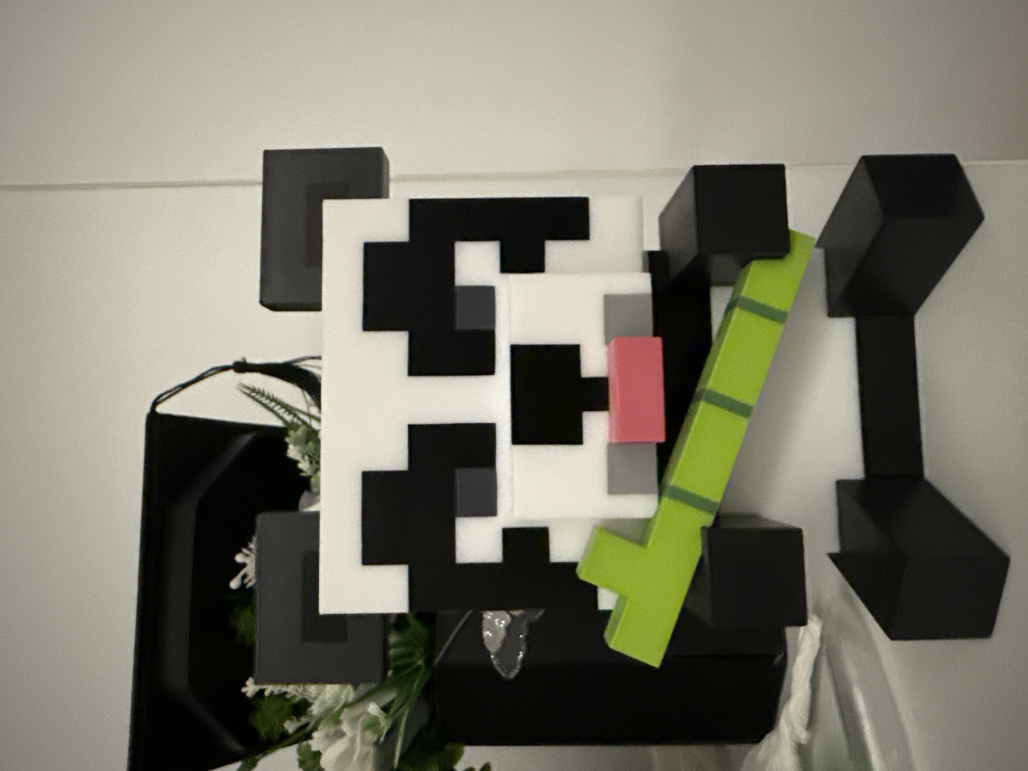 pixelated, stylized representation of a panda face holding a green bamboo stalk, likely a decorative object, affixed to a light-colored wall. The panda's face is primarily black and white, with a pink nose and gray shading. The bamboo stalk is a light green color with darker green stripes. The overall arrangement appears to be part of a display or decoration, possibly in a room or interior space. In the lower foreground, there is a glimpse of a black box and some white and green floral elements. The city and country cannot be verified from this image.