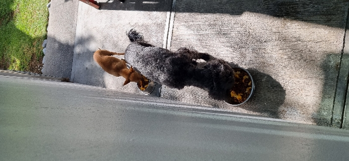 - "Two dogs eat from separate food bowls on a concrete surface" by FM-rGZrc2, licensed under CC BY 4.0