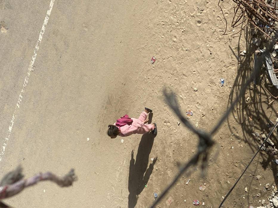 An overhead shot captures a small girl in a pink outfit, possibly a jumpsuit, with a matching backpack, walking on a dirt and pavement surface. Her shadow extends from her. Litter and discarded cans dot the ground. A partially visible rusted metal heap sits in the upper right corner. An indistinct object dangles in the lower left, and a transmission pole and its shadow are visible on the right. A painted white line marks one side of the pavement.