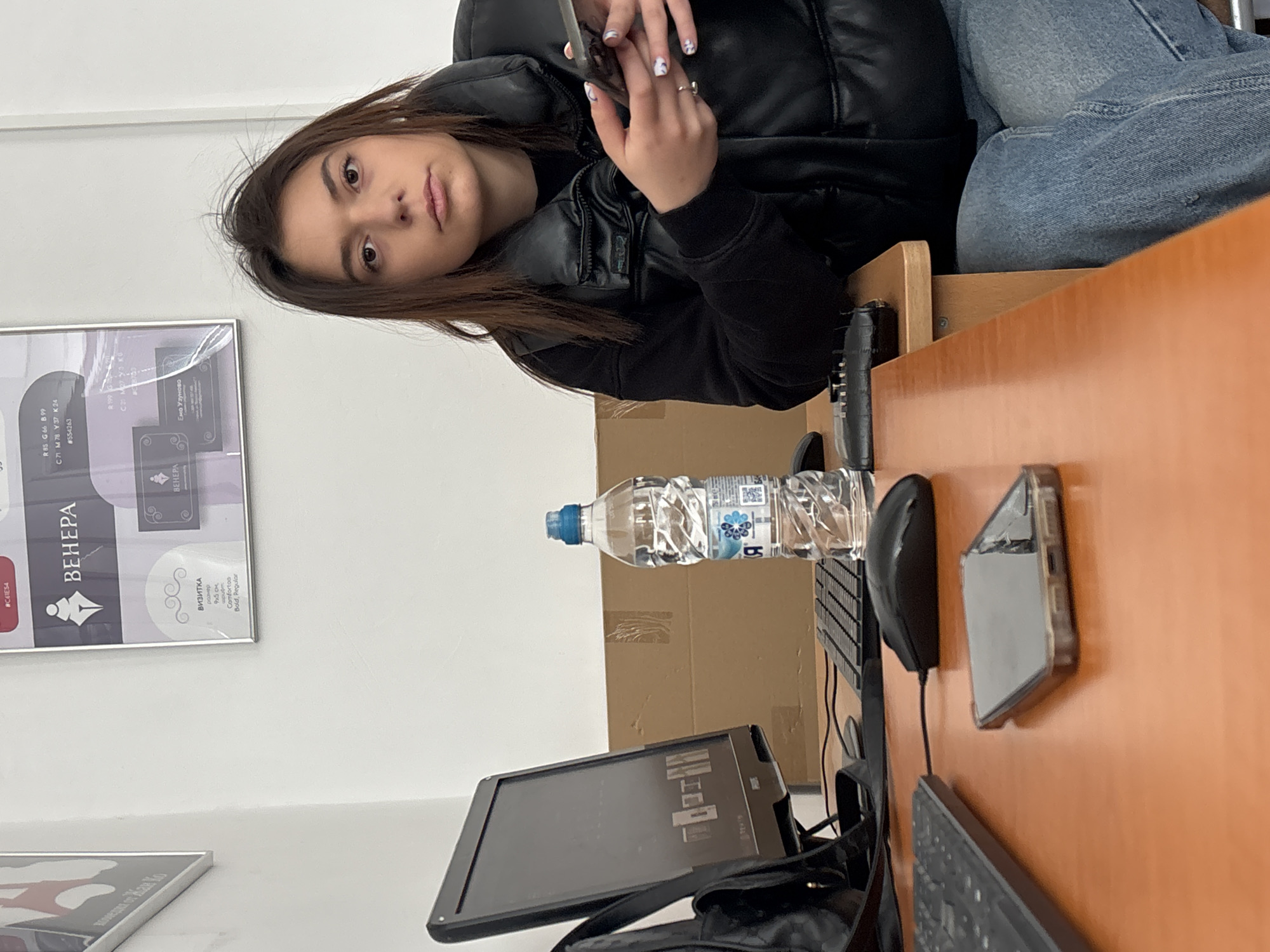 A woman is sitting at a desk in Troyan, Bulgaria. She is wearing a black puffy vest and blue jeans and is holding a smartphone in her hands. On the desk, there is a computer monitor, a water bottle, a mouse, a keyboard, and a phone. There are two framed advertisements on the wall. One is for a company called "BEHEPA".